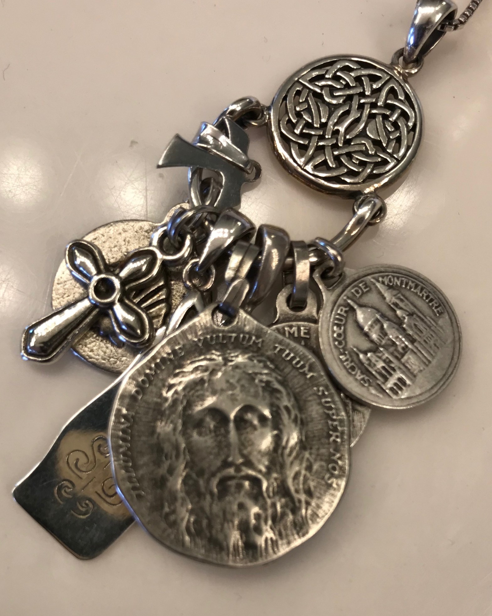 You can see the image in the picture of my necklace — a necklace that holds my treasures from all the pilgrimages/hikes we have been on. If the shroud is real, this is what Jesus would have looked like. Many believe this is the cloth that Jesus was wrapped in at his burial (John 20:6–9) and that the mysterious image was created as some kind of radiation was emitted from his body as he was resurrected from the dead.
